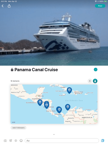 Creating a digital diary of your cruise vacation is an easy process once you import vacation photos into the Journi Blog app and add your own text-based captions. Shown here is an example of a map created by the app after a cruise that shows where the ship traveled. (Shown on an iPad Pro.)