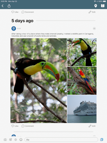 Add as much or as little text as you desire in conjunction with as many photos as you want from each day of your cruise, and create a separate diary for each vacation. (Shown on an iPad Pro.)