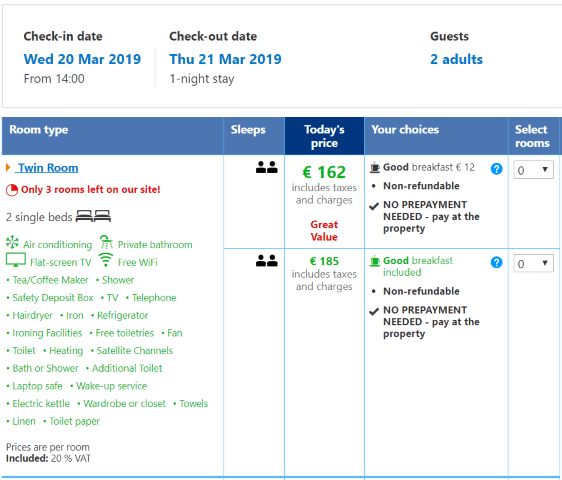 It can be also the case that booking.com will have the cheapest price. Savvy consumers must visit the Google metasearch engine and use it as a comparison tool, before deciding from which company to book the hotel room.